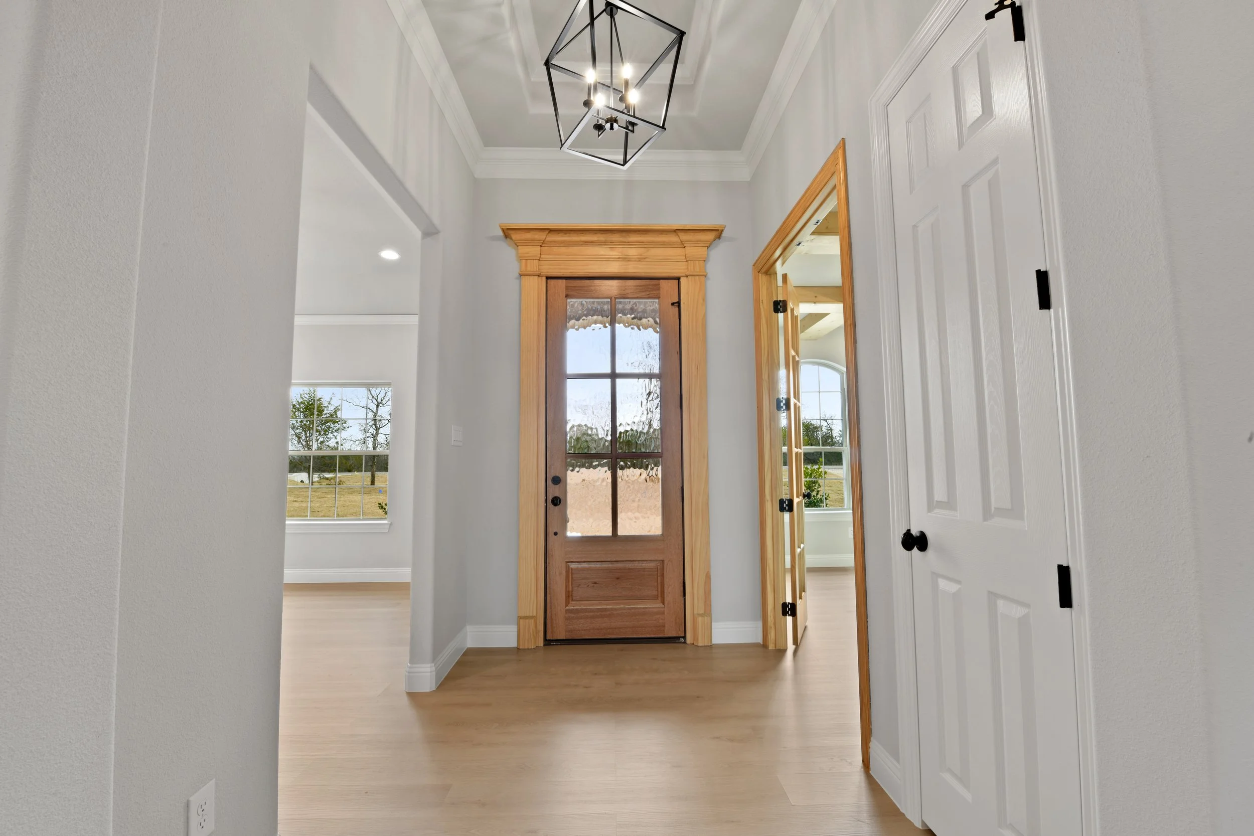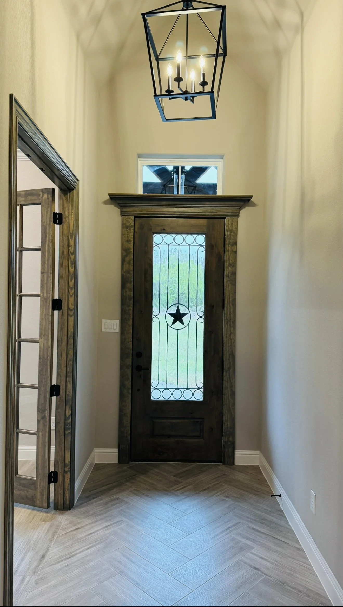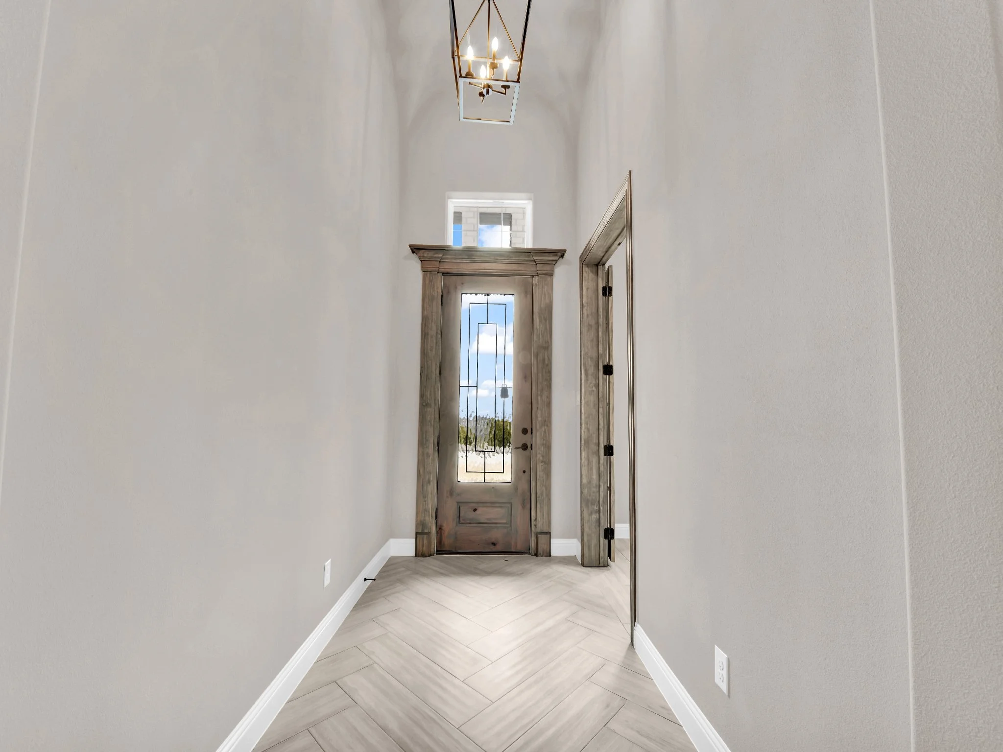 Bright hallway with light gray walls, herringbone-patterned wood floor, and a wooden front door with glass panels. A ceiling light fixture is visible.