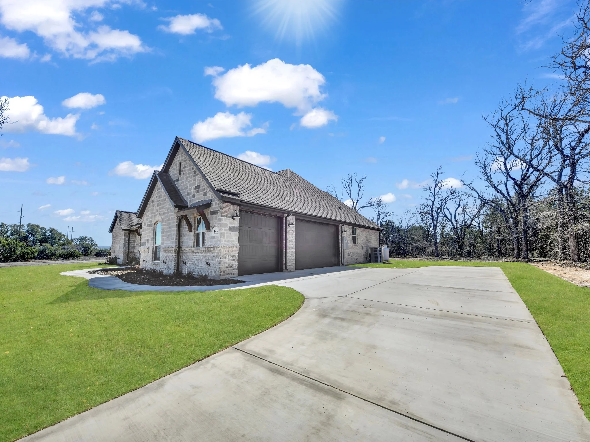 Suburban house with a three-car garage, brick exterior, and driveway under a blue sky with clouds.