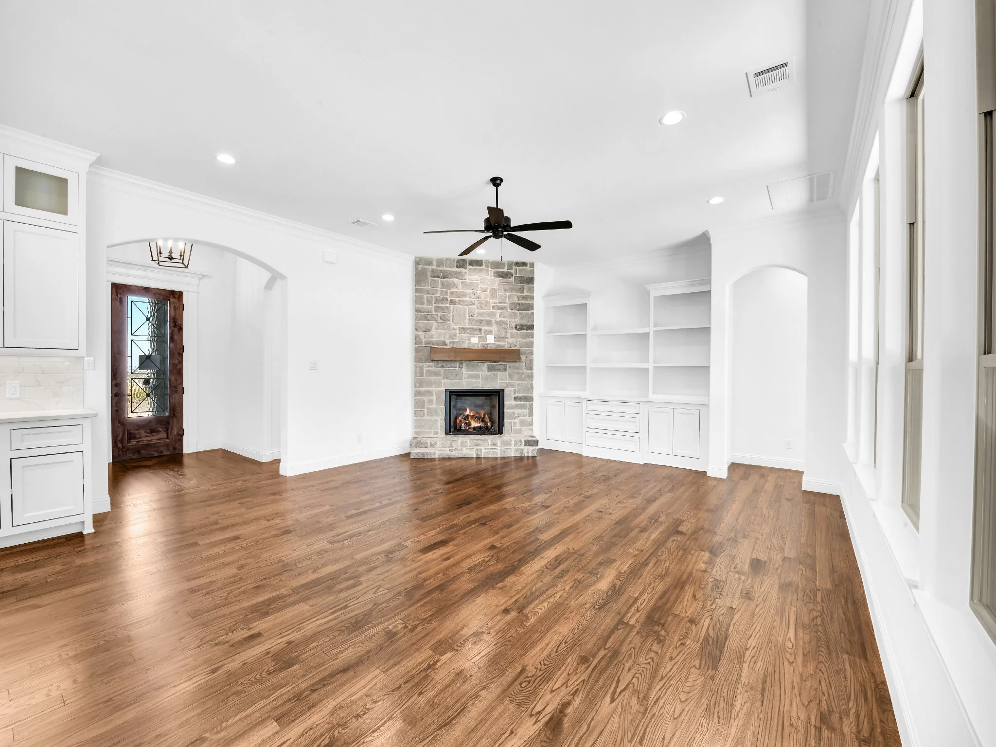 Spacious living room with hardwood floors, stone fireplace, built-in shelves, ceiling fan, and a wooden door.