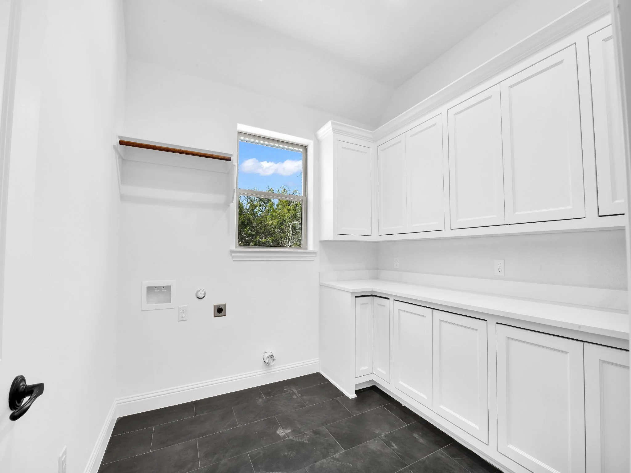 Modern laundry room with white cabinets, dark tile floor, and a small window with a view of trees.