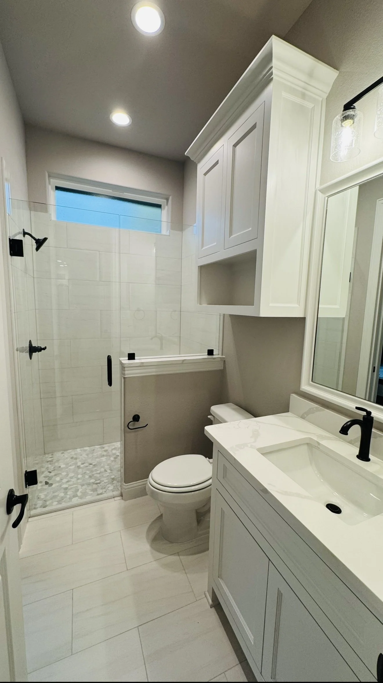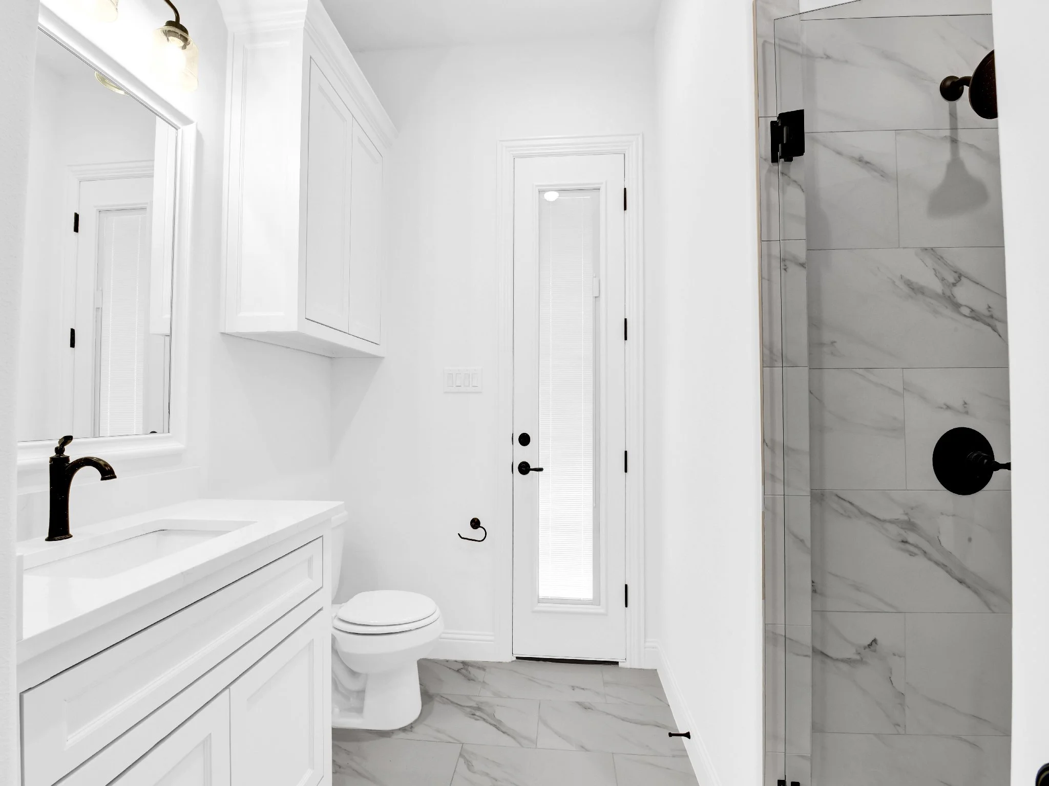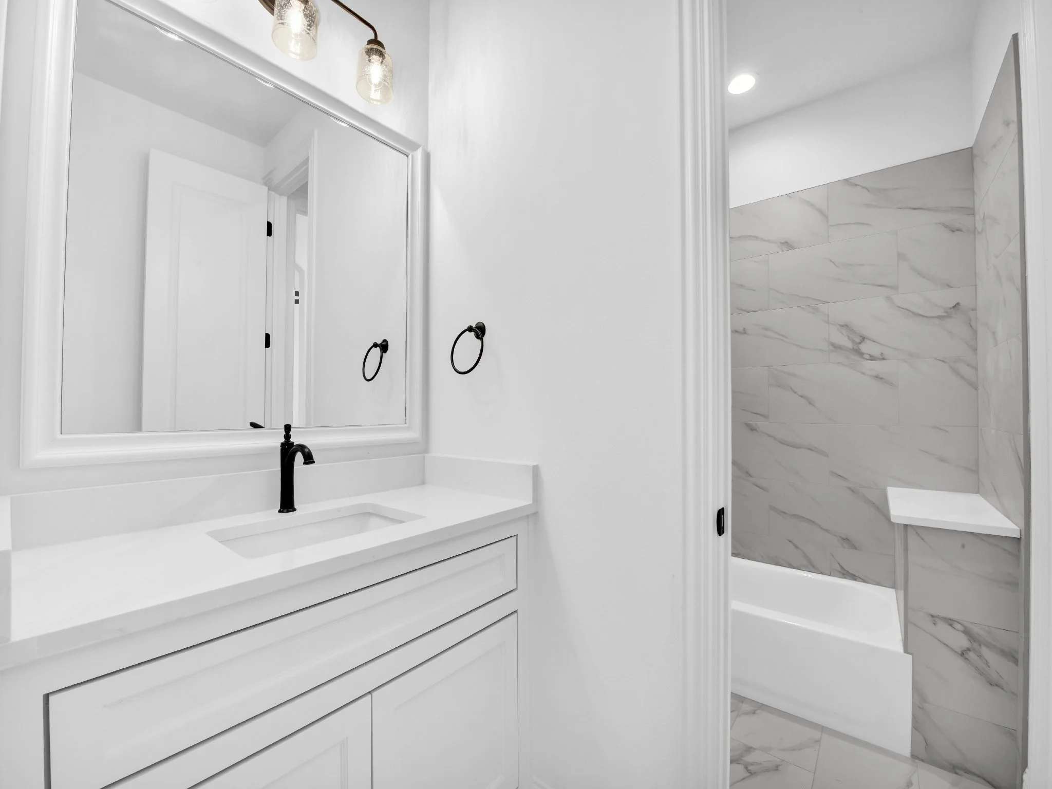 Modern white bathroom with a large mirror, black faucet, white countertop and cabinets, and marble tiled shower area.