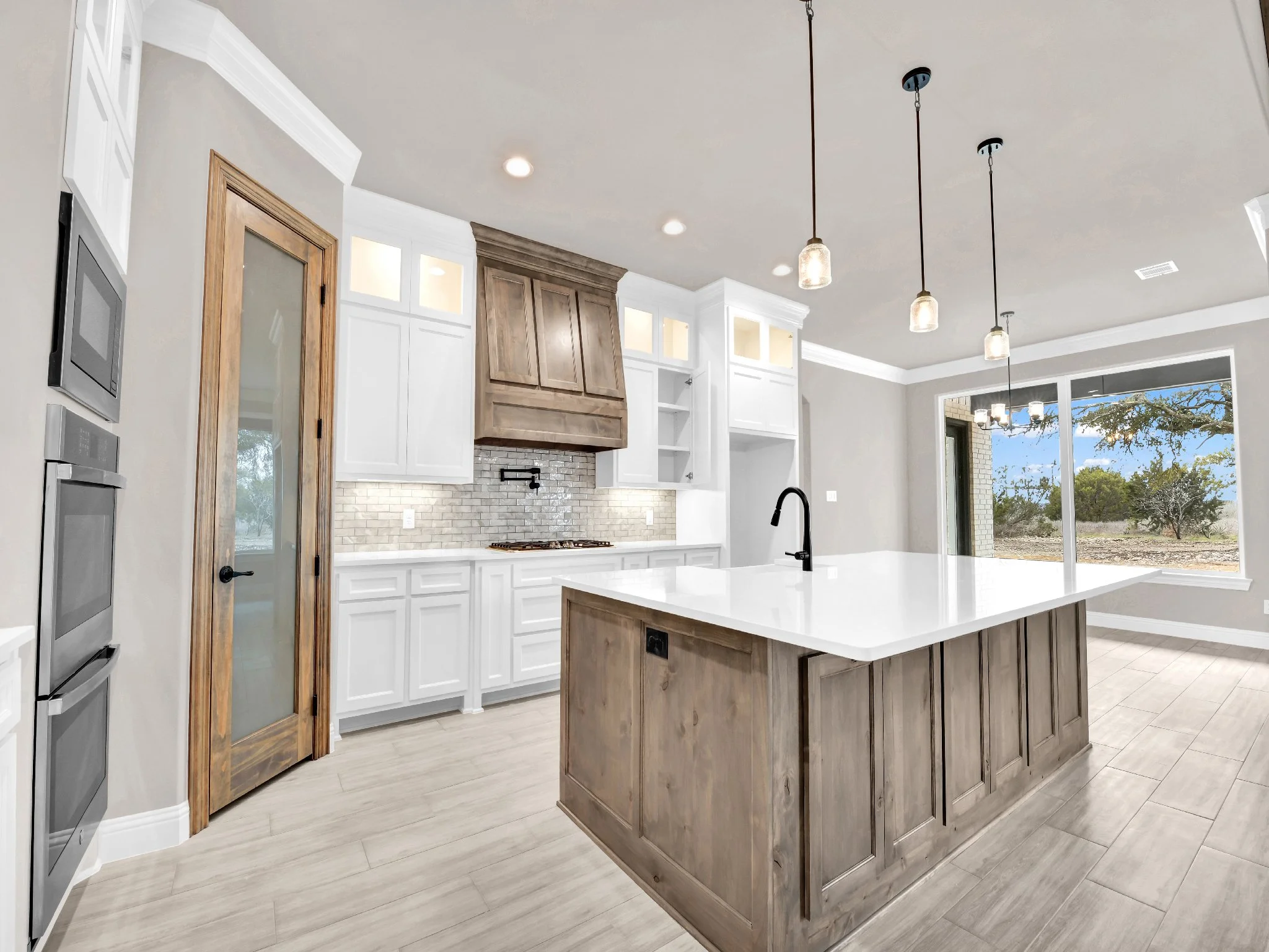 Modern kitchen with an island, white cabinets, wood accents, stainless steel appliances, pendant lights, and a large window with an outdoor view.