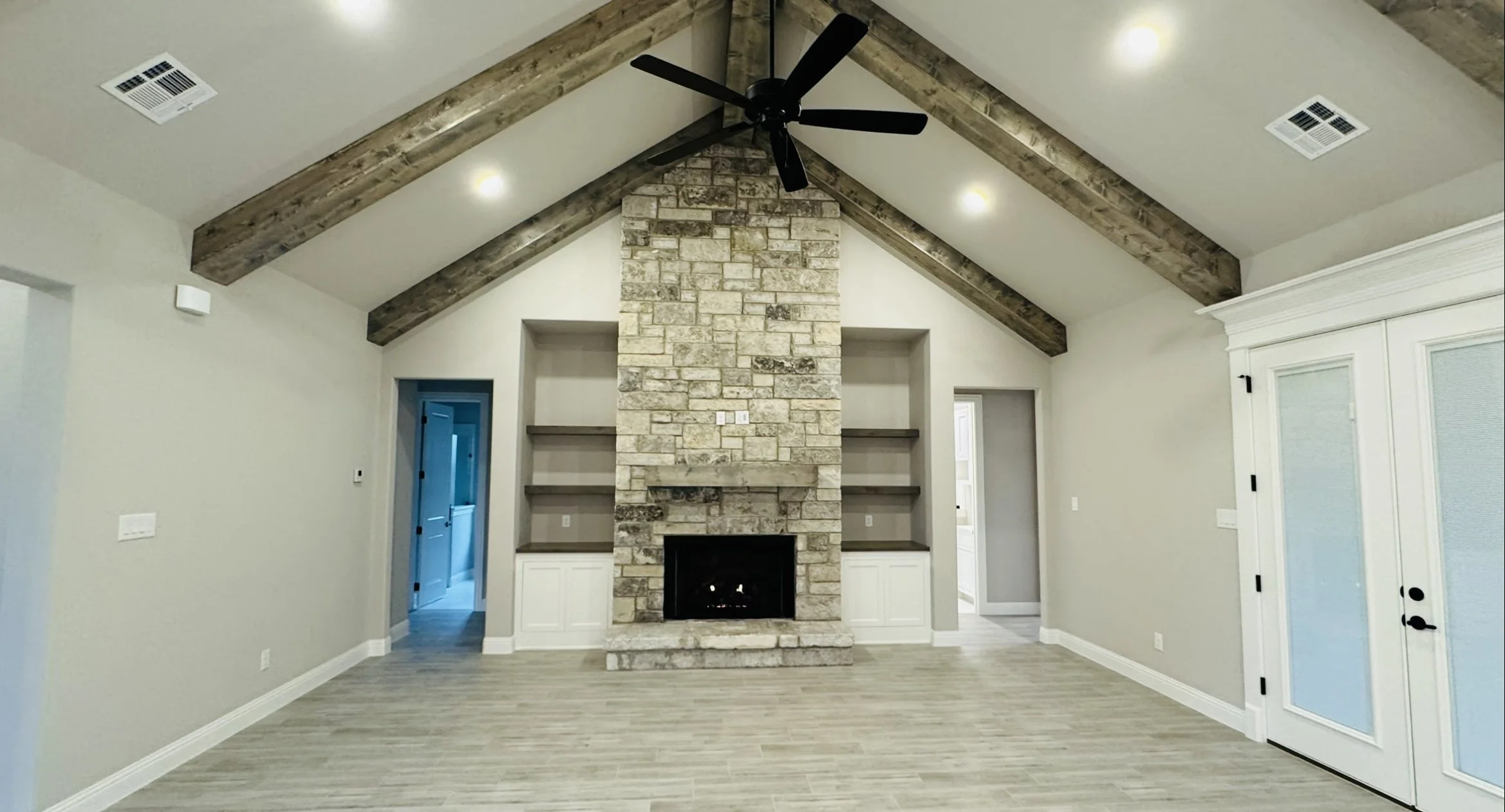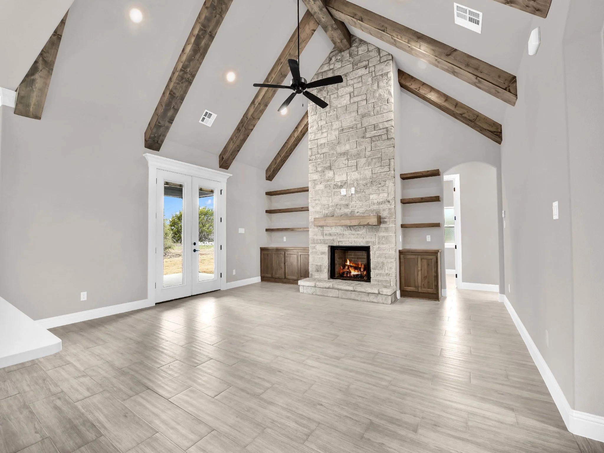 Spacious living room with vaulted ceiling, exposed wooden beams, stone fireplace, built-in shelves, and French doors.