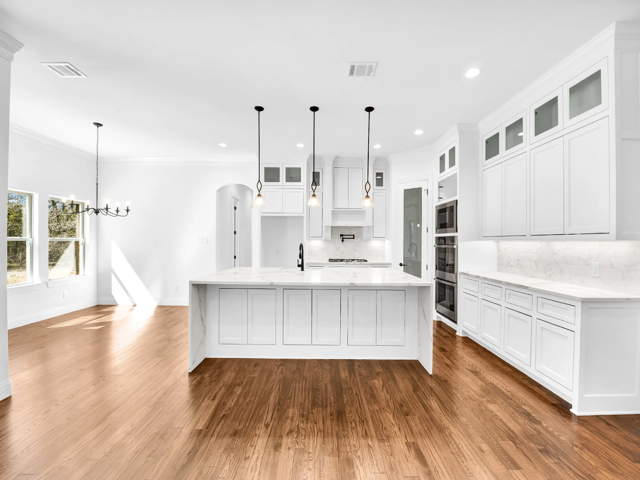 Modern kitchen interior with white cabinetry, an island with marble countertop, pendant lighting, wooden floors, and dining area with chandelier.