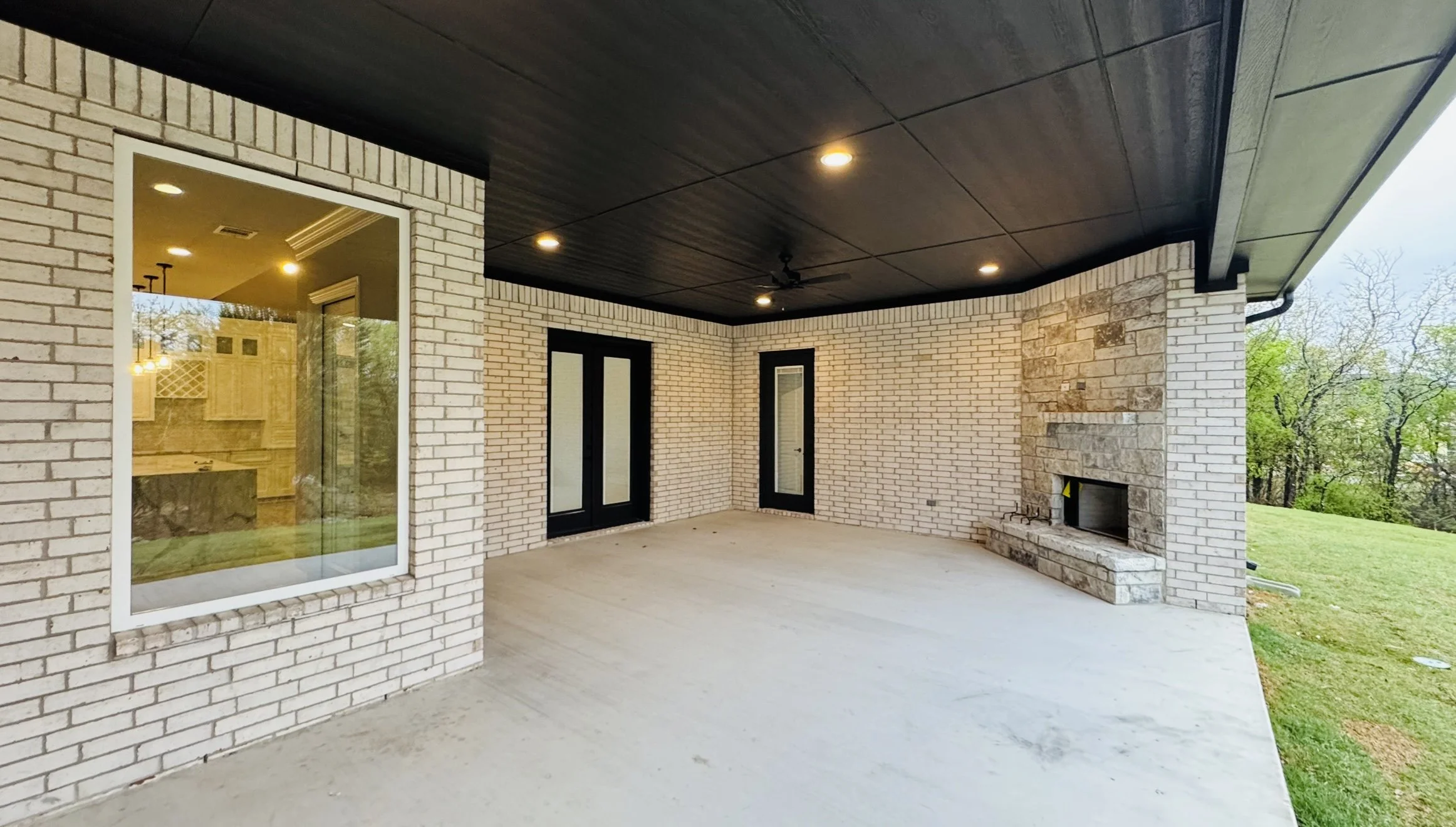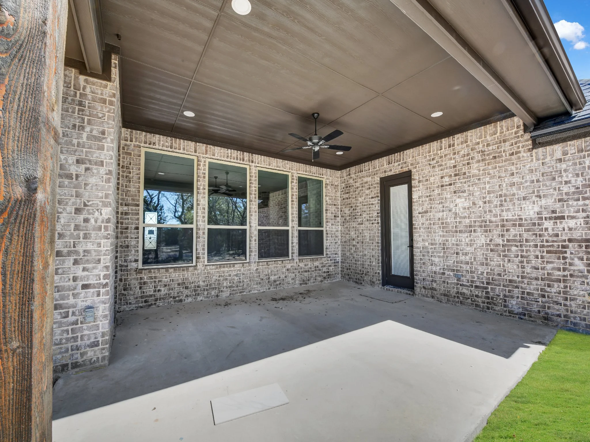 Covered outdoor patio with brick walls, ceiling fan, and a glass door leading inside. Lawn is adjacent to the concrete floor.