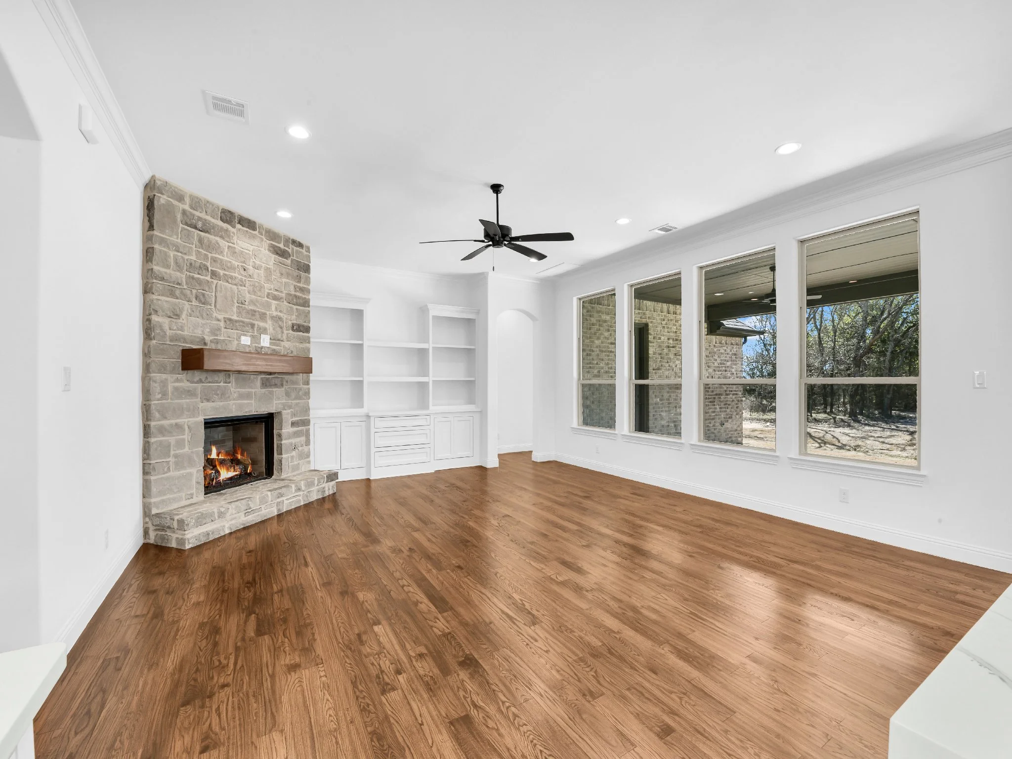 Spacious living room with a stone fireplace, hardwood floors, built-in white shelves, a large ceiling fan, and multiple large windows offering natural light.