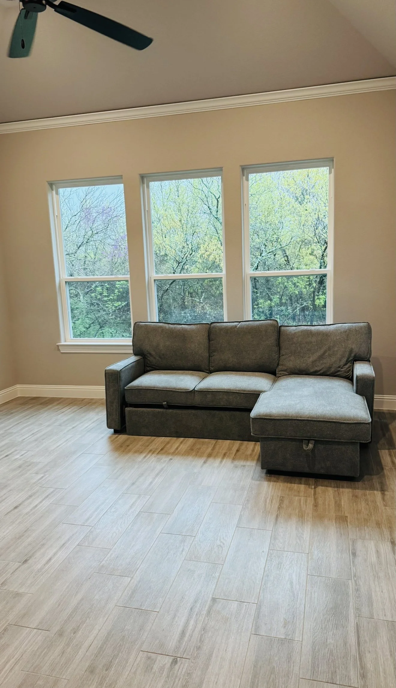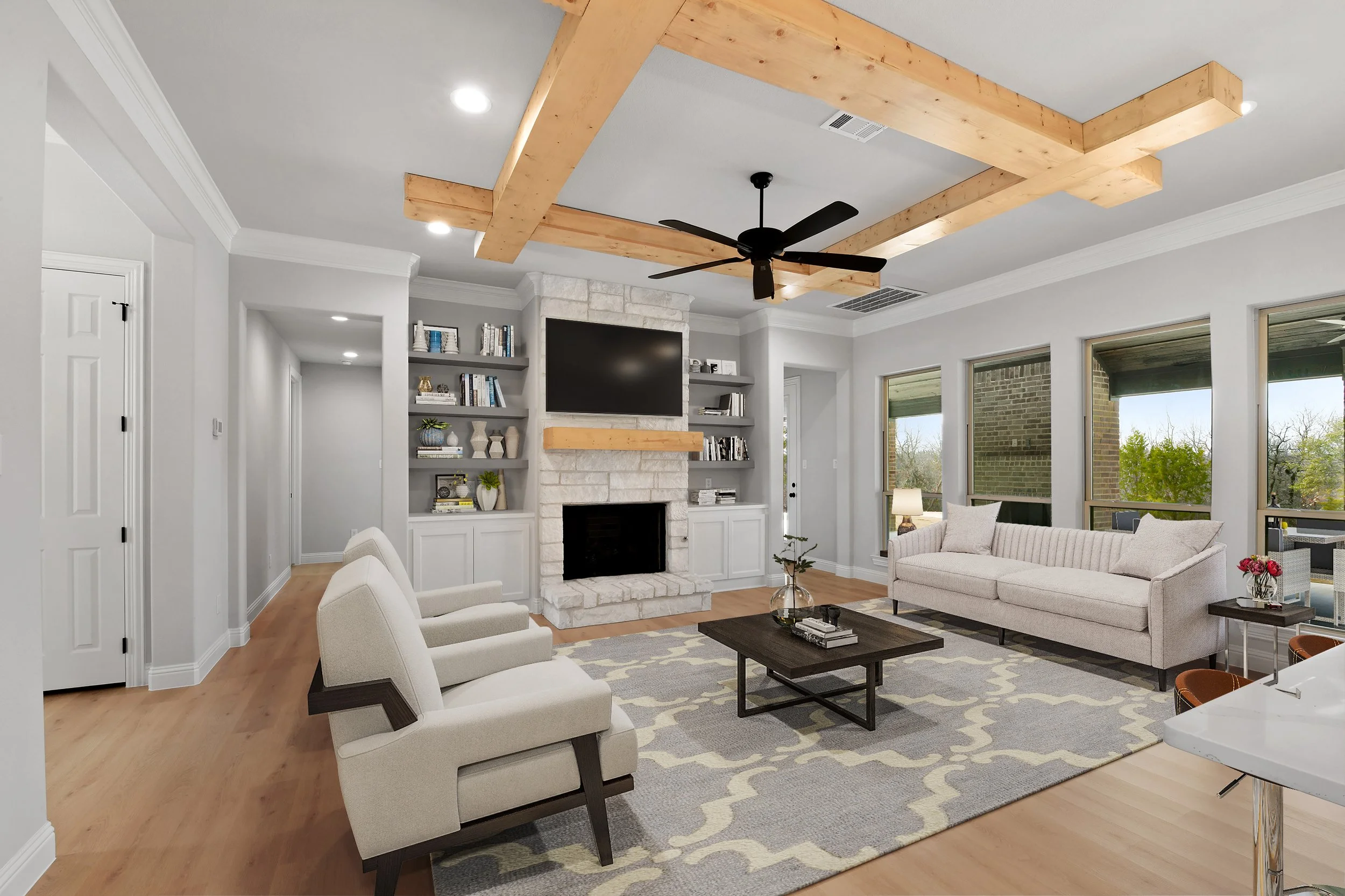 Modern living room with neutral tones, featuring a beige sofa, two armchairs, a dark wood coffee table, ceiling fan, and a stone fireplace with a TV above. Large windows offer a view of greenery outside.
