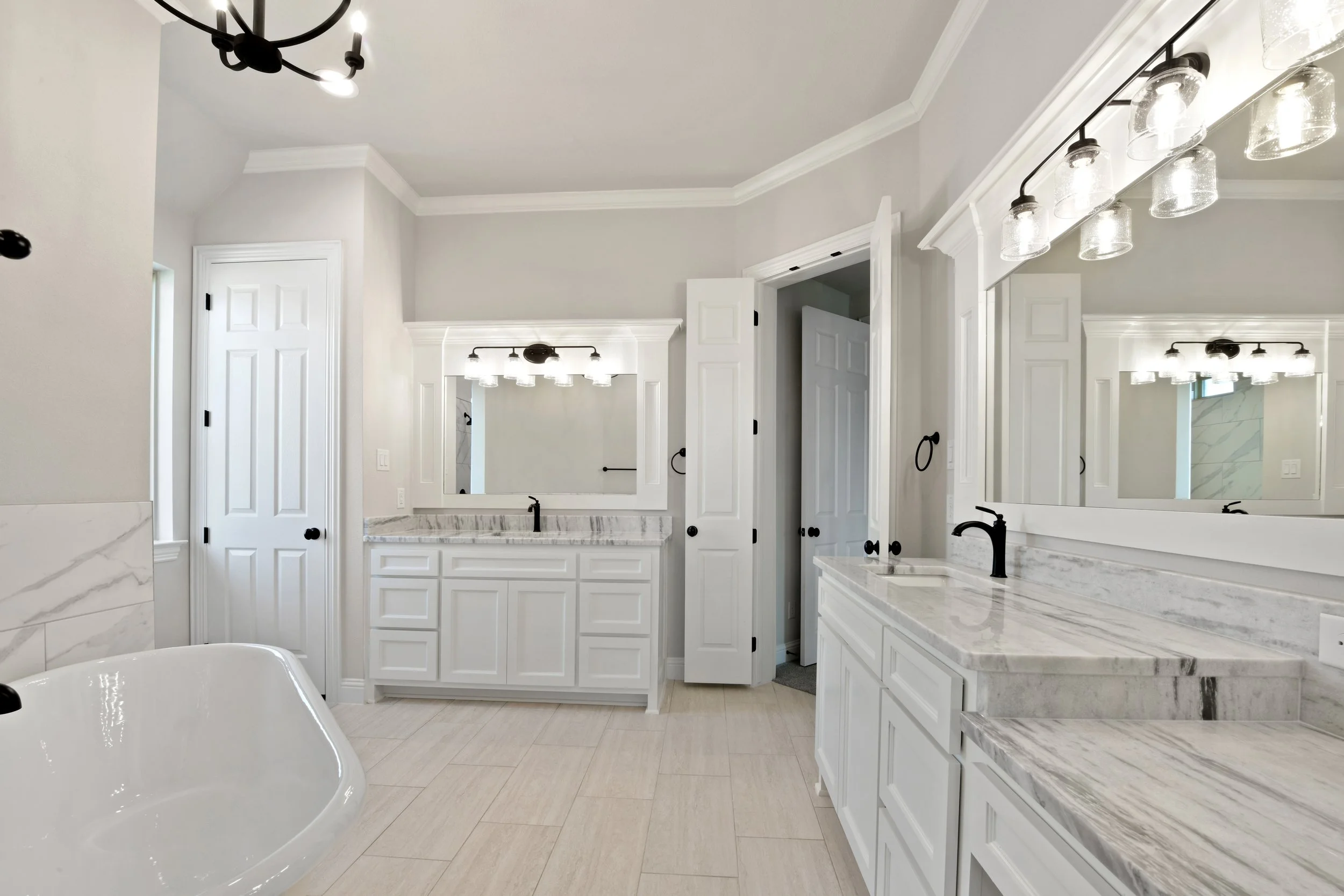 Modern bathroom with white cabinetry, marble countertops, dual sinks, large mirrors, a bathtub, and elegant lighting fixtures.