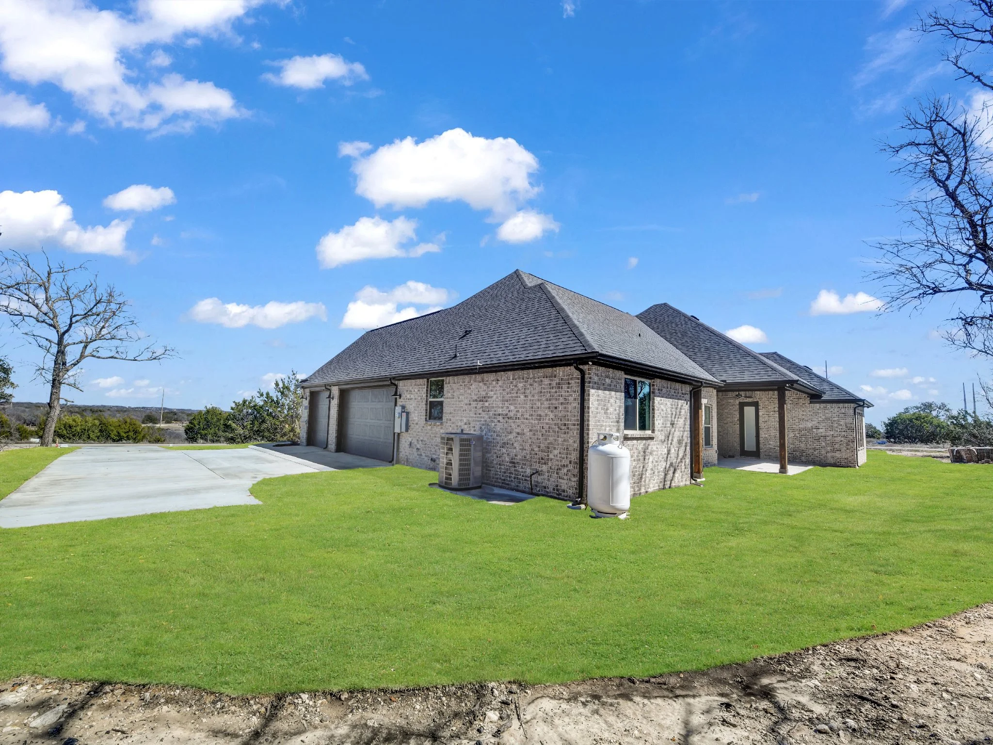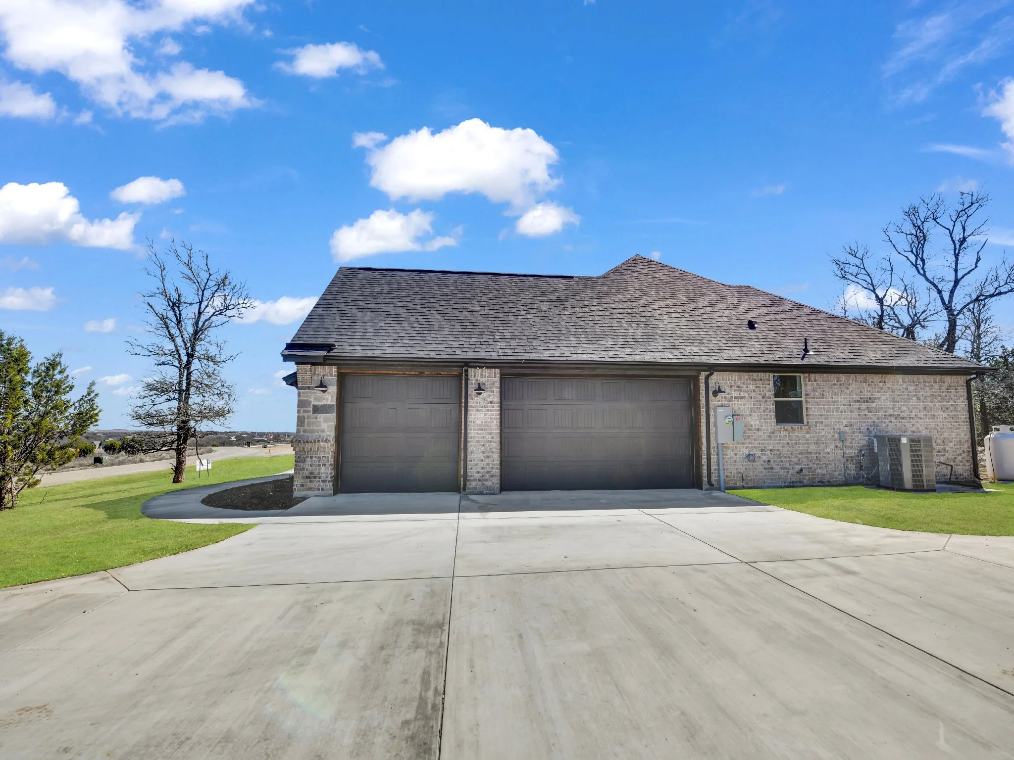 Brick house with gray roof, garage, green lawn, and trees under a blue sky with clouds.