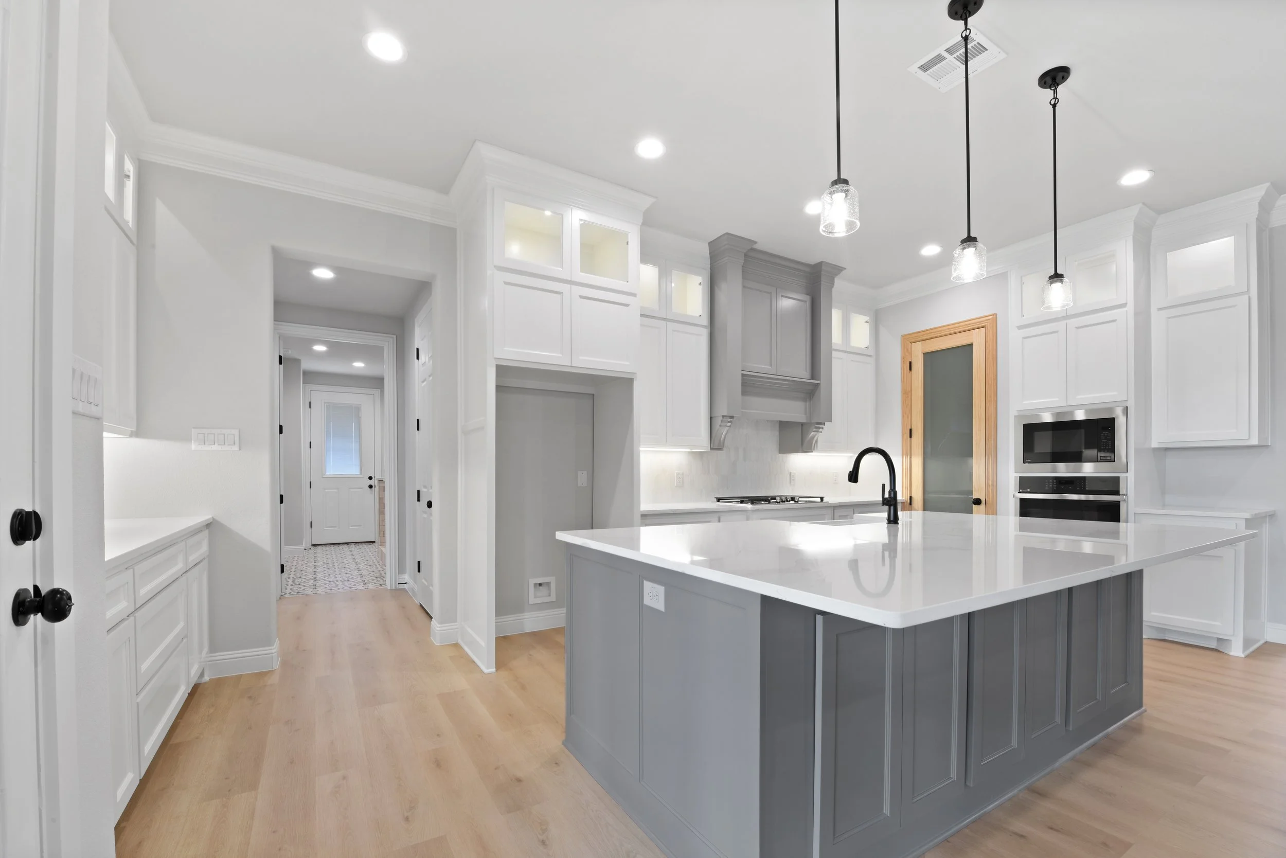 Modern kitchen with white cabinetry, gray island, black faucet, pendant lights, and wooden floor.