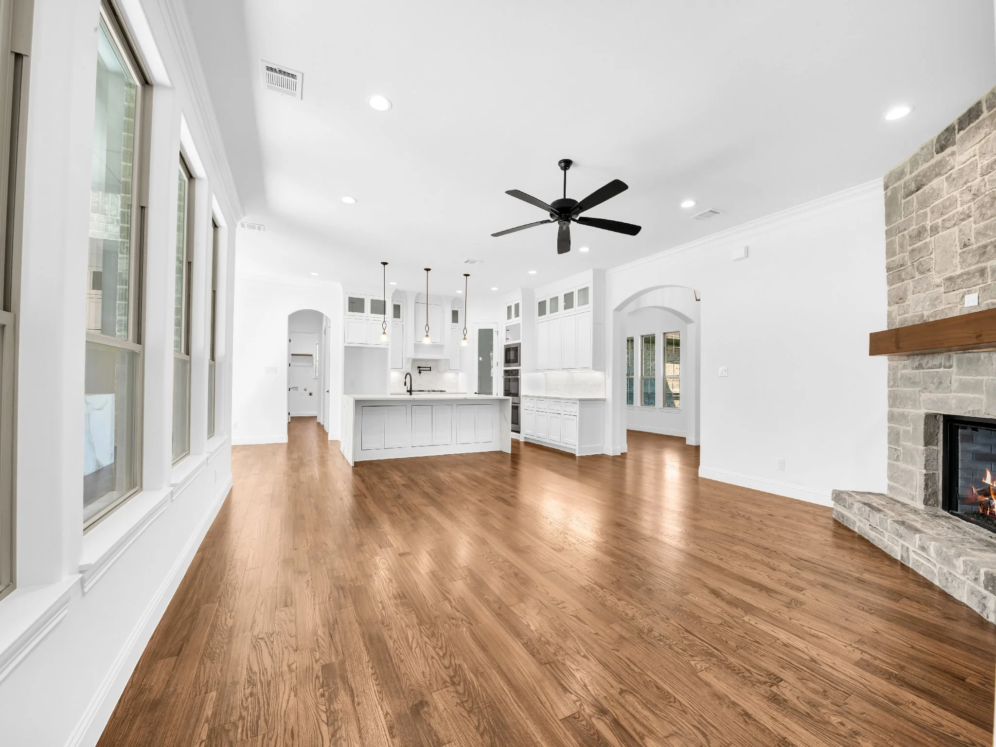 Modern open-concept living room and kitchen with hardwood floors, white walls, a stone fireplace, and a ceiling fan. The kitchen features an island, pendant lighting, and white cabinetry.