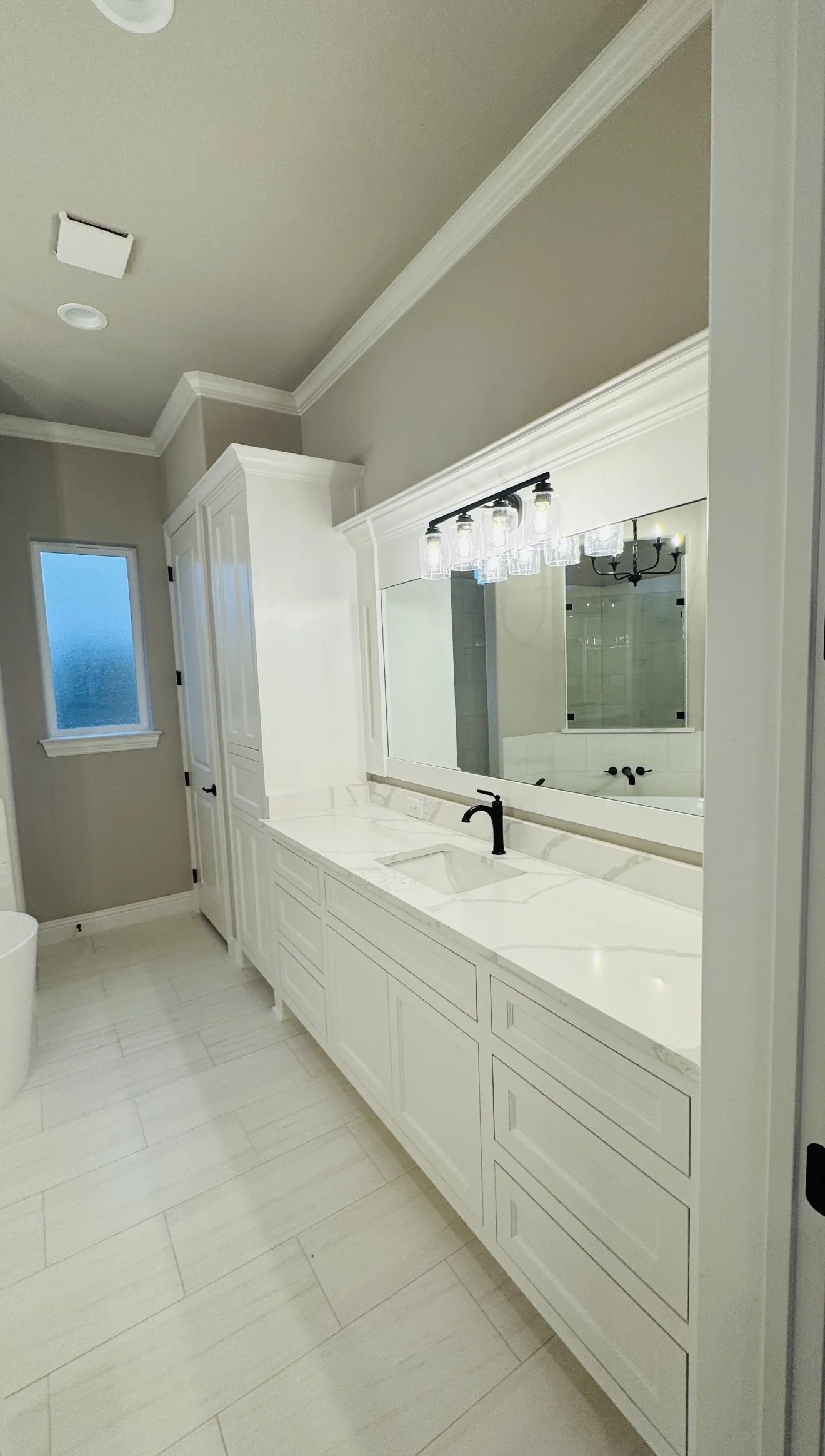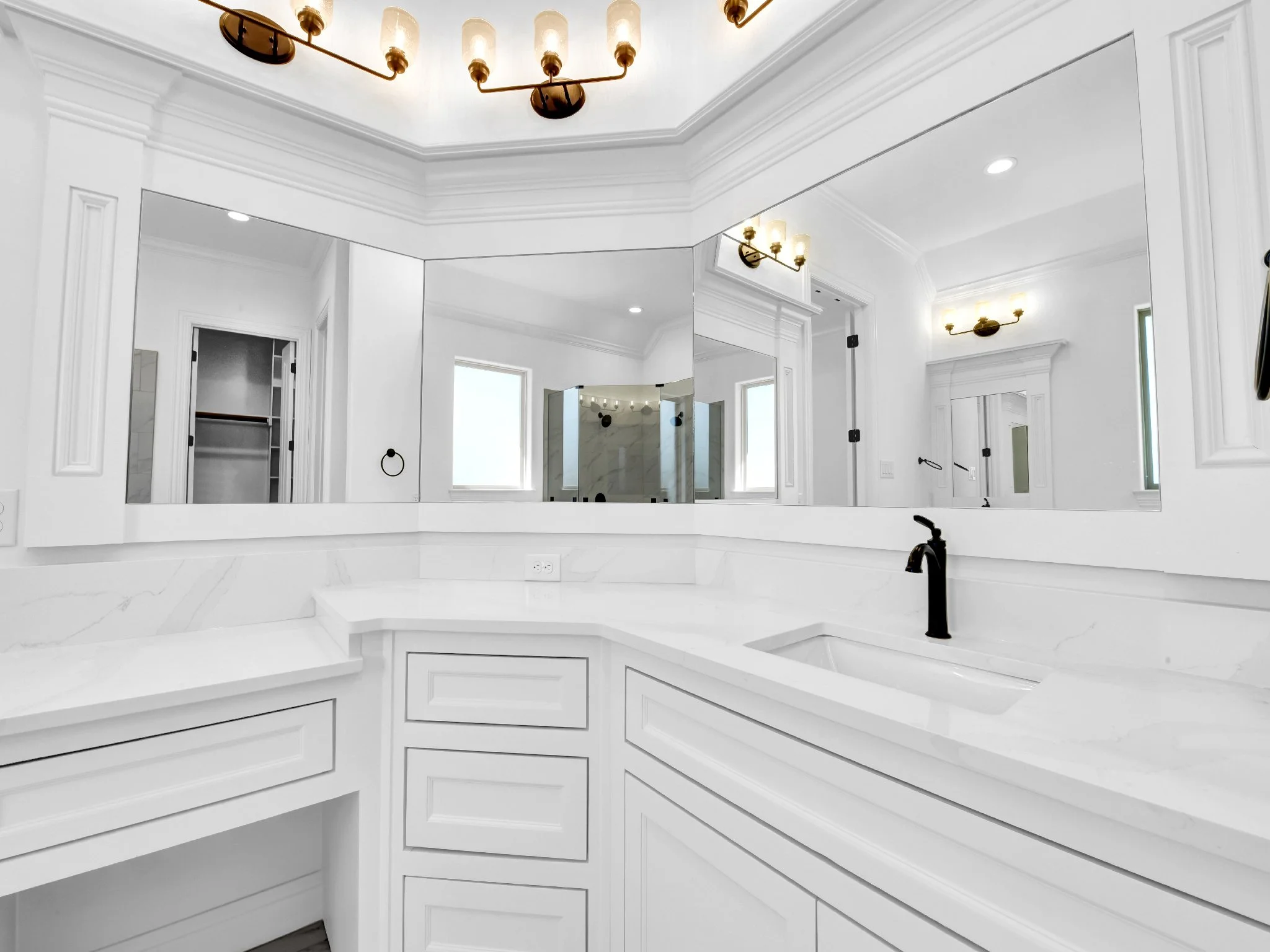 Modern white bathroom with a black faucet, large mirror, and overhead lighting fixtures. The vanity has multiple drawers beneath a marble countertop.