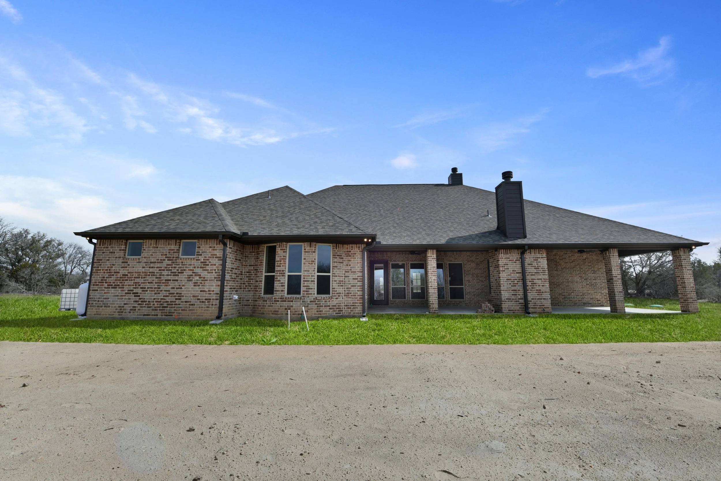 Rear view of a brick residential house with a large patio and chimney.