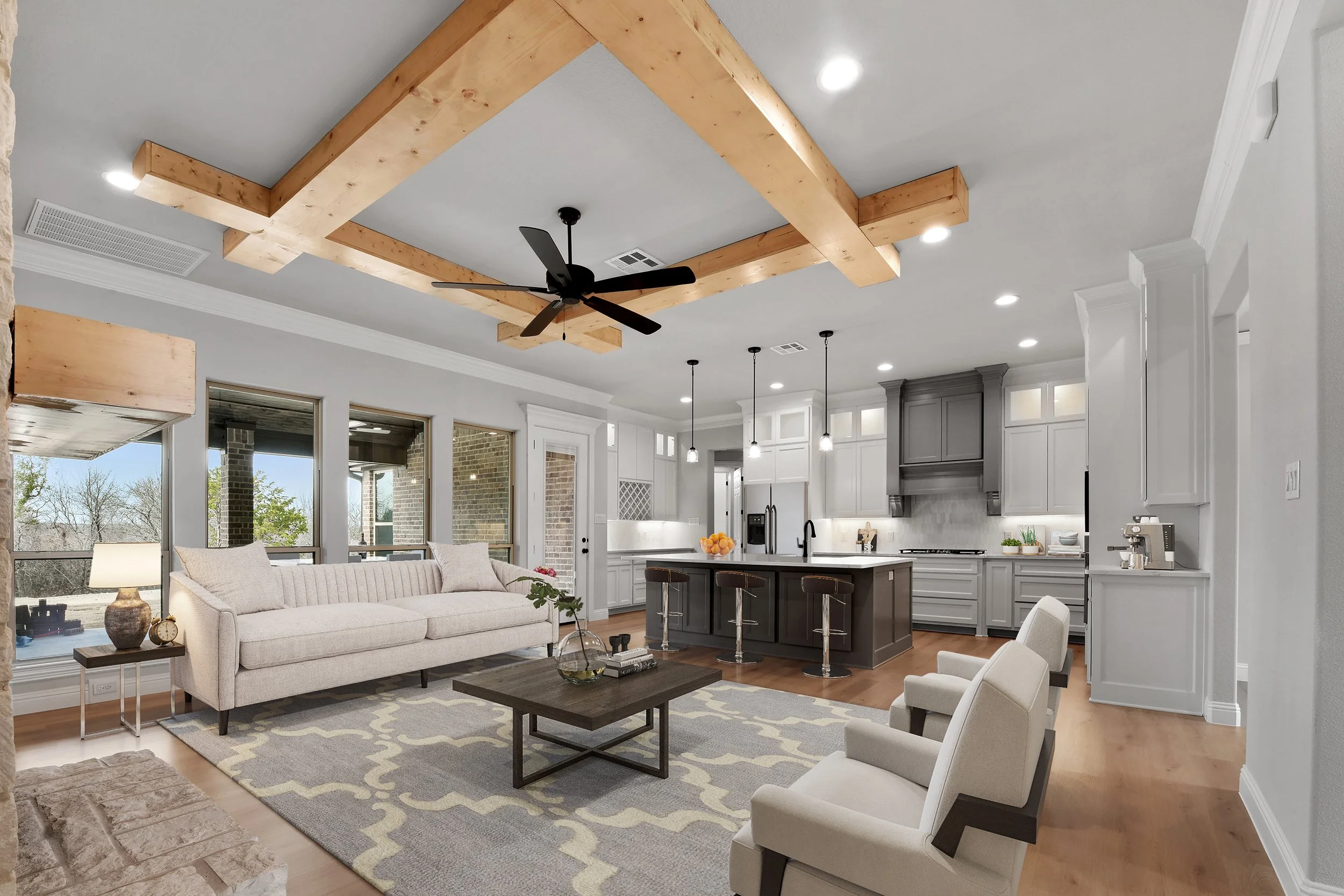 Modern open-concept living room and kitchen with light gray walls, wooden ceiling beams, a cozy beige sofa, armchairs, coffee table, and a kitchen island with bar stools.