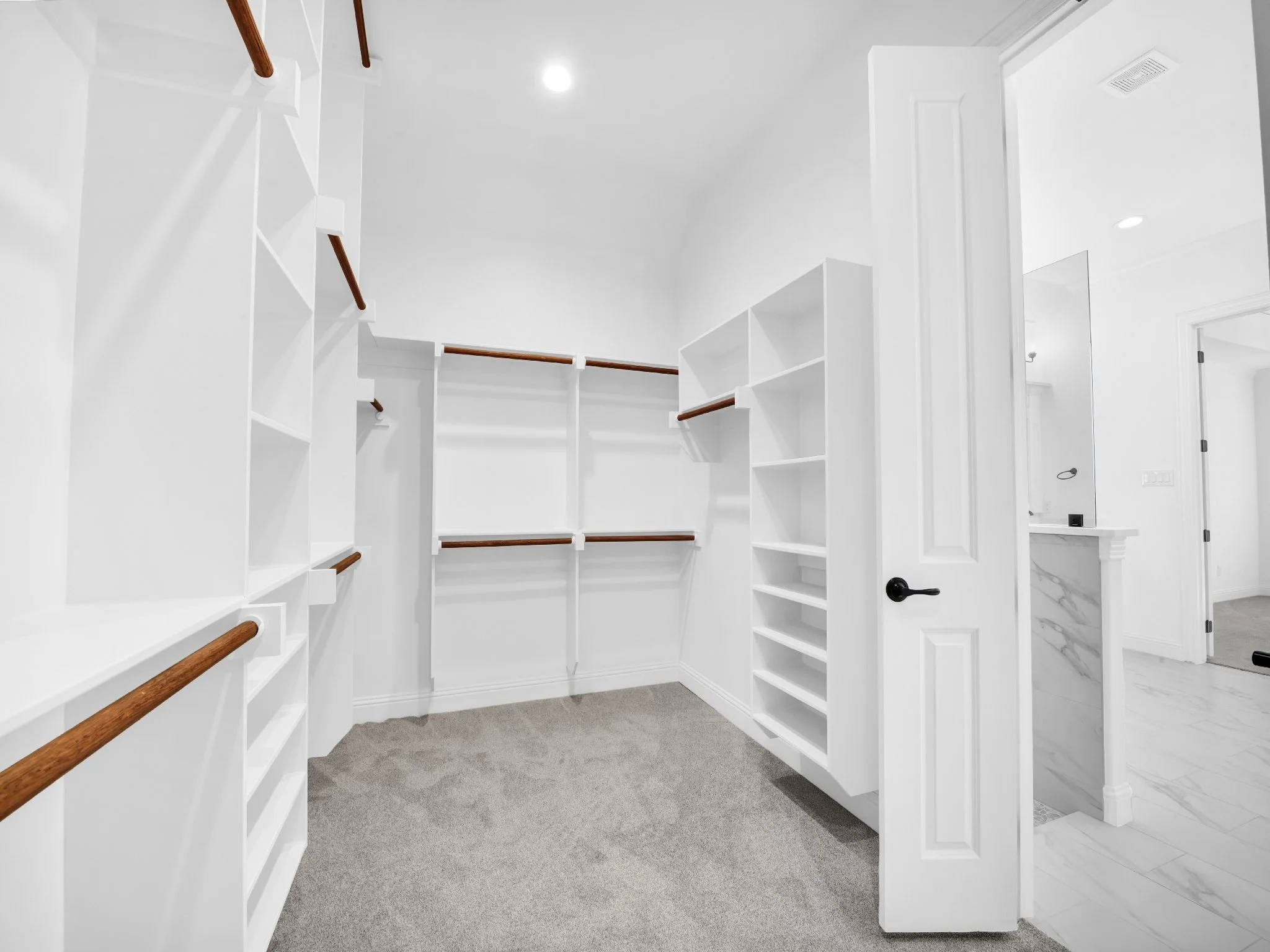 Spacious white walk-in closet with built-in shelves, hanging rods, and carpet flooring.