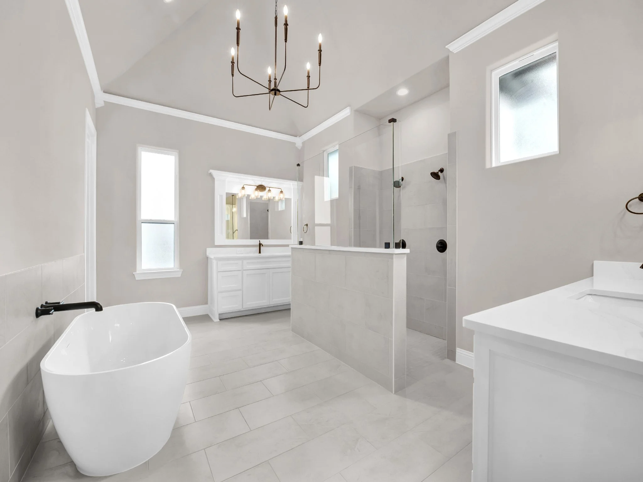 Modern bathroom with freestanding tub, glass shower, double vanity, neutral tile floor, and hanging chandelier.