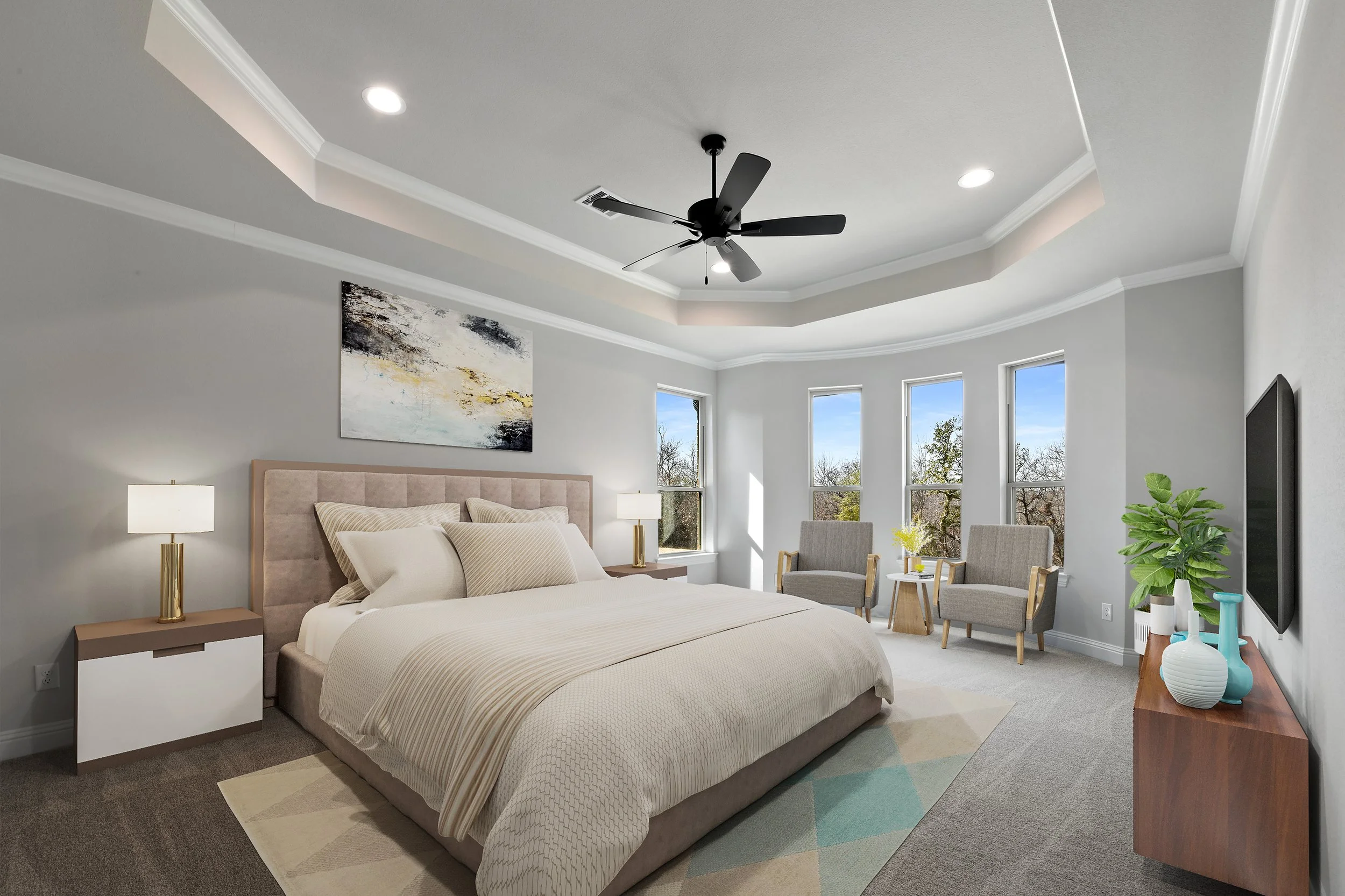 Modern bedroom with a king-sized bed, upholstered headboard, abstract wall art, nightstands with lamps, ceiling fan, bay windows, two armchairs with a small table, and a dresser with decorative vases and a plant.