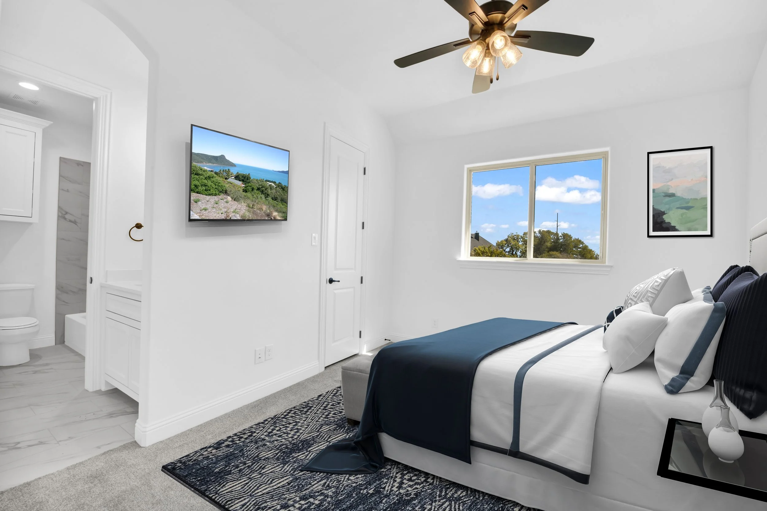 Modern bedroom with white walls, a bed with blue and white bedding, a ceiling fan, a wall-mounted TV, a window with a view, and a doorway leading to a bathroom.
