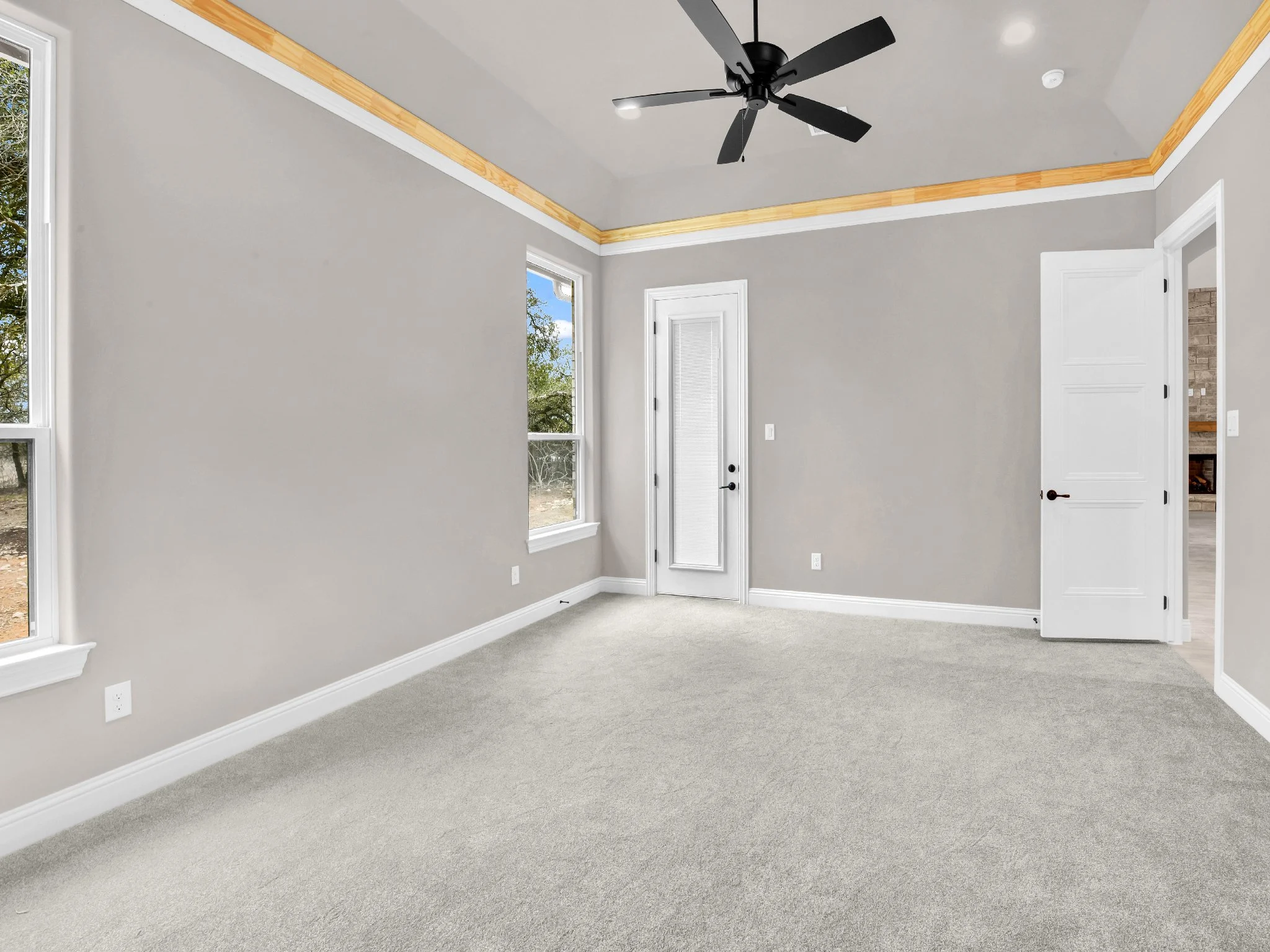 Empty room with gray carpet, light gray walls, two large windows, a white door, a ceiling fan, and wood trim detailing.