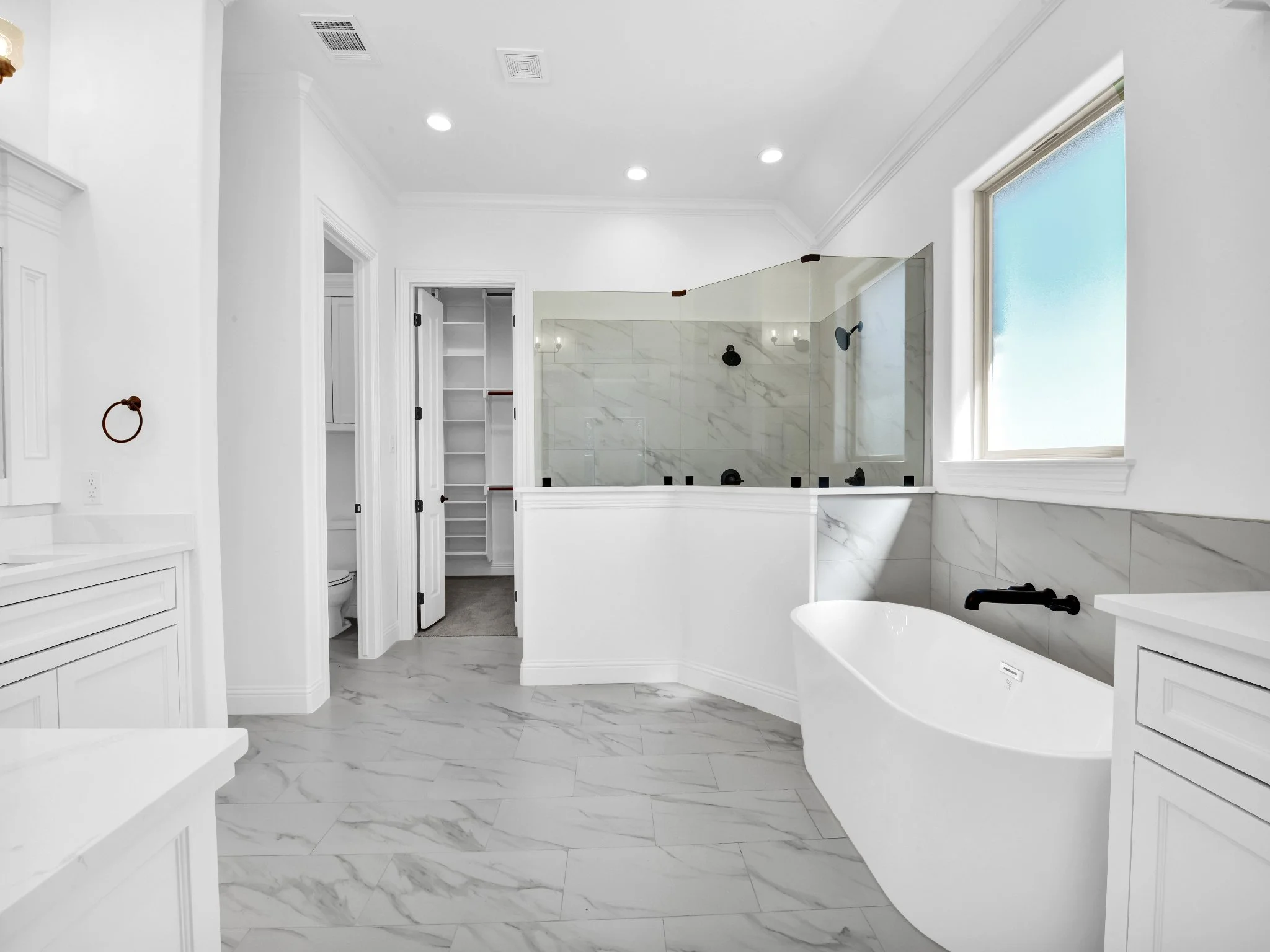 Modern white bathroom with a freestanding bathtub, glass-enclosed shower, marble tile walls and floor, vanity with a mirror, black fixtures, and overhead lighting.