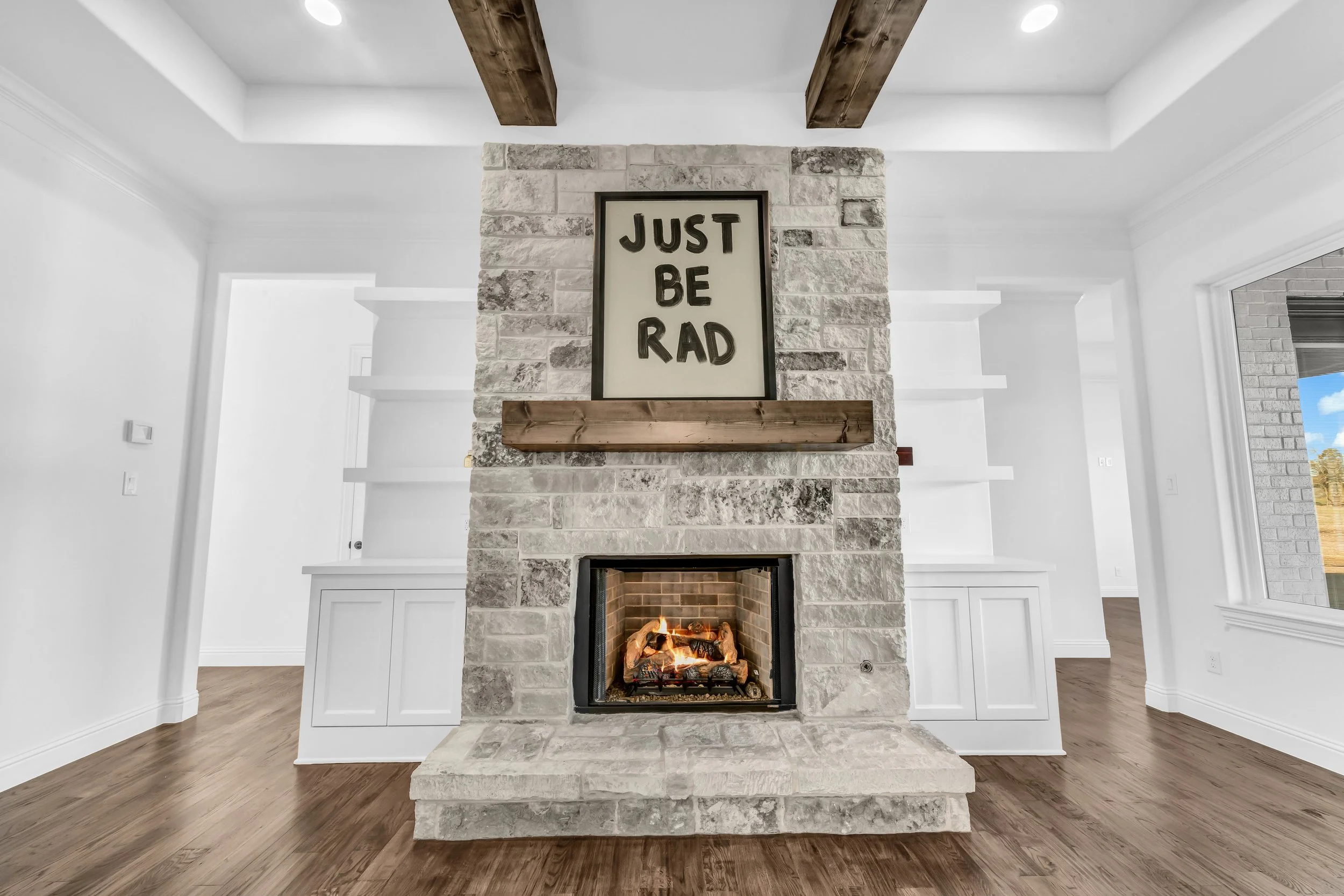 Modern living room with stone fireplace, wood mantel, and "Just Be Rad" sign above. White walls, hardwood floors, and built-in shelves on either side.