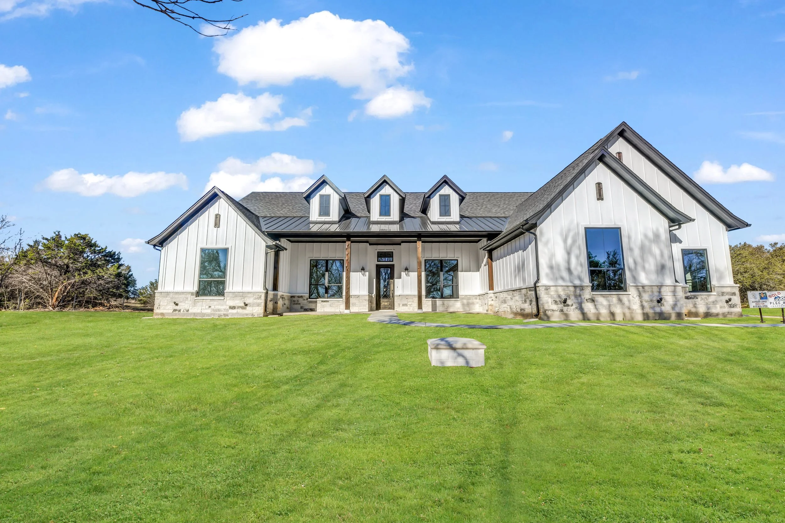 Modern single-story farmhouse-style house with white exterior, black roof, and large windows, surrounded by green lawn under a blue sky with clouds.