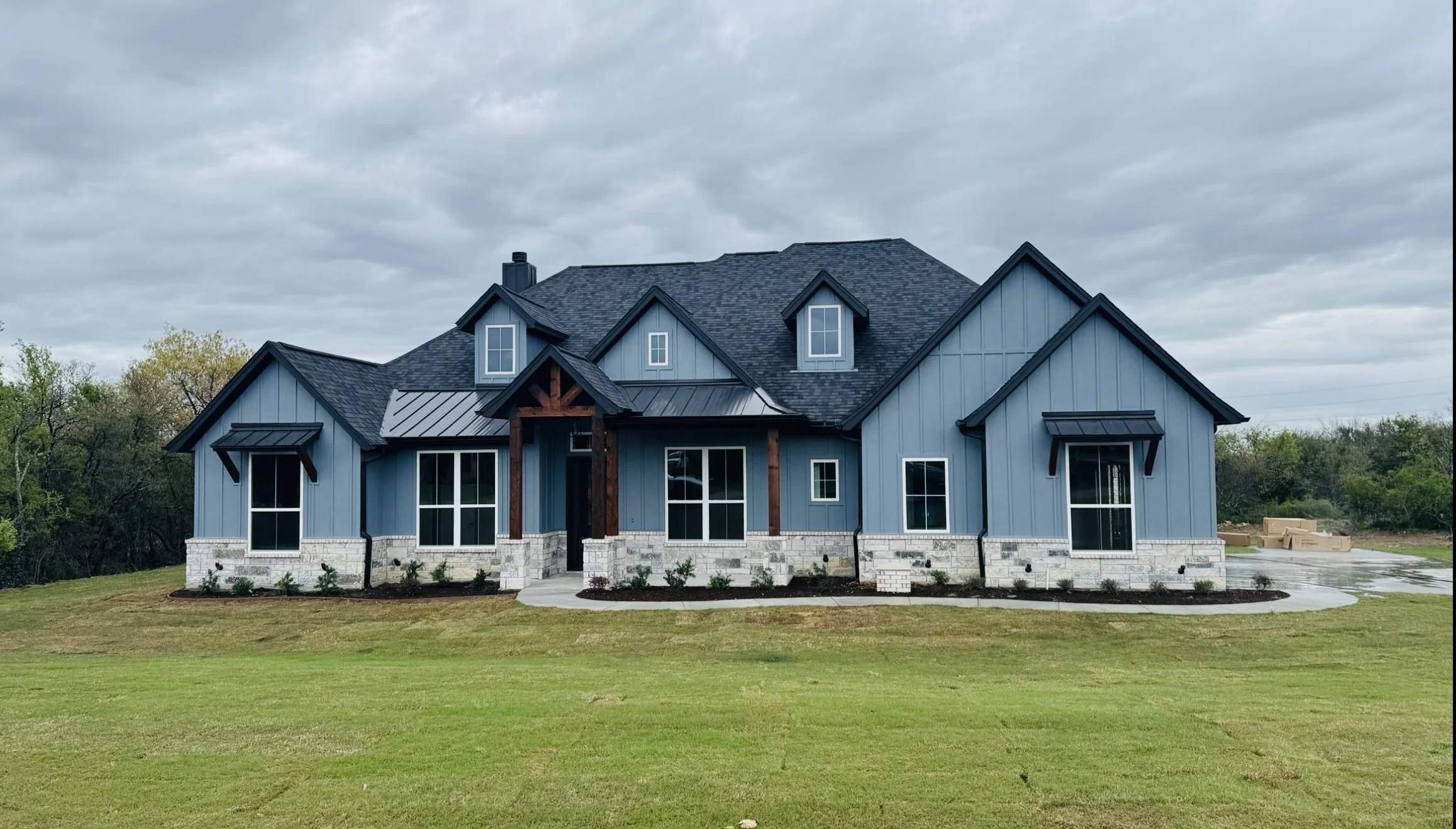 Modern ranch-style house with dormer windows and expansive lawn under a blue sky.