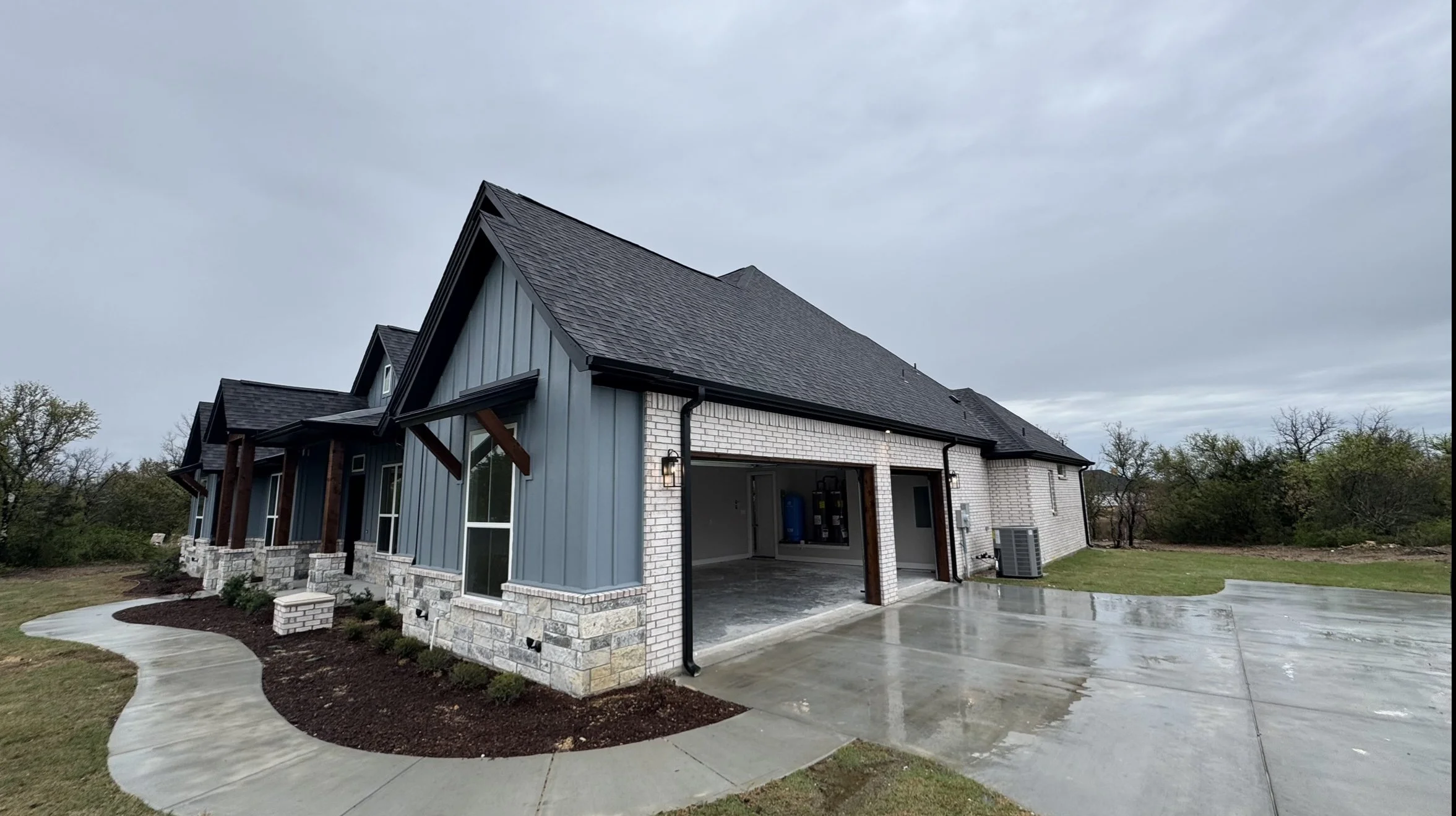 A large, modern brick house with a three-car garage, surrounded by a green lawn and trees, under a clear blue sky.