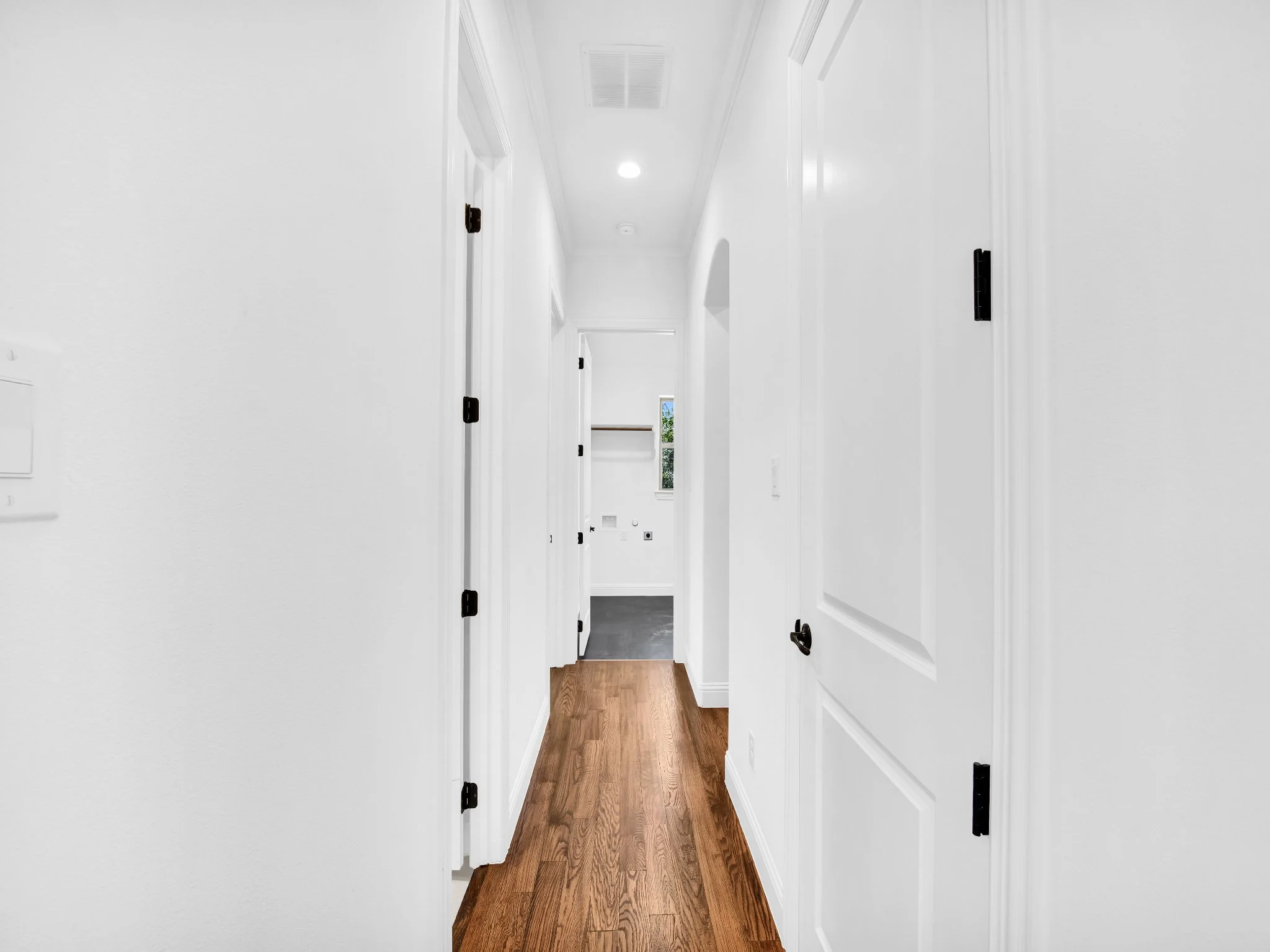 Interior hallway with white walls and wooden floor, several doors on each side, and ceiling lights.